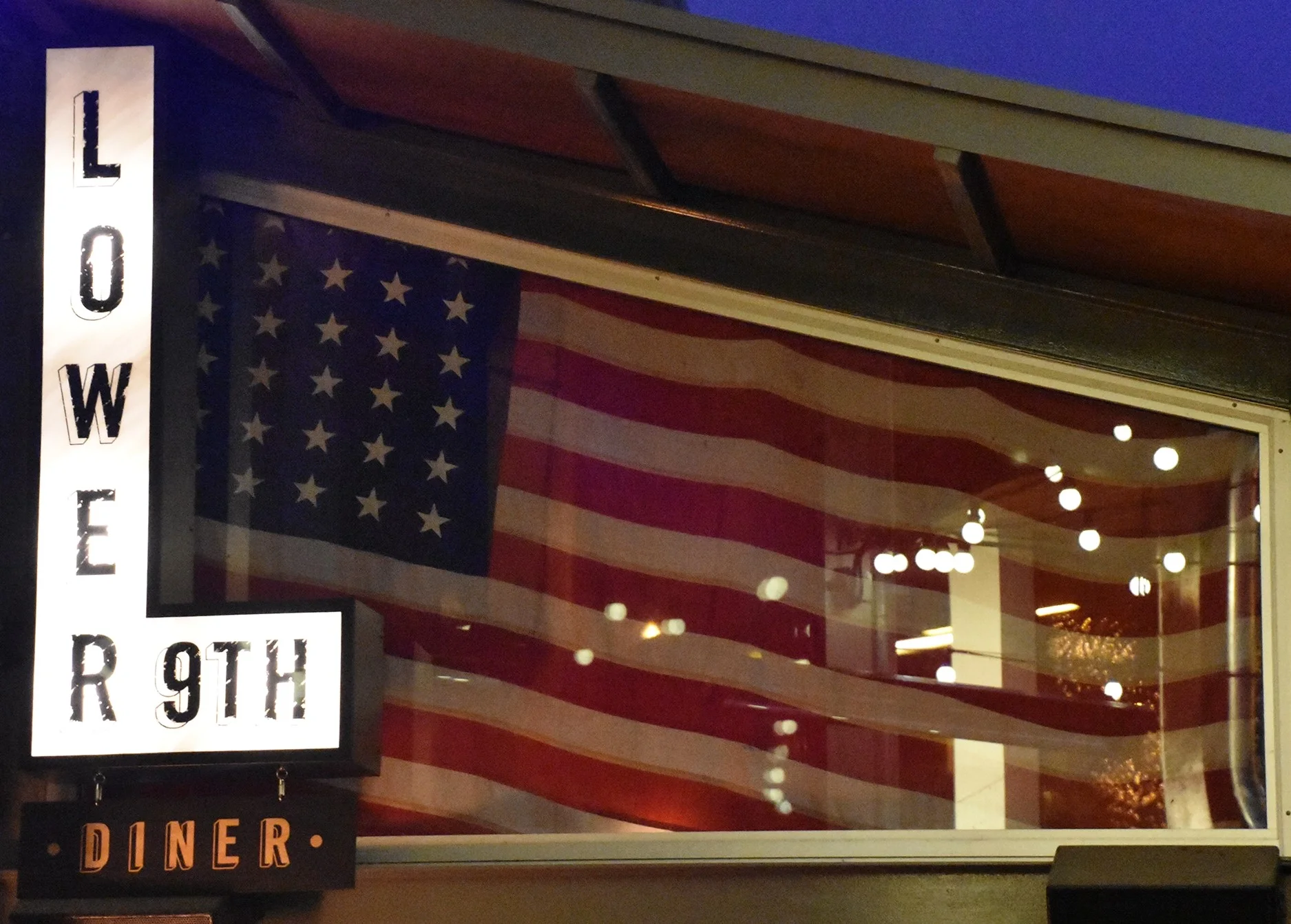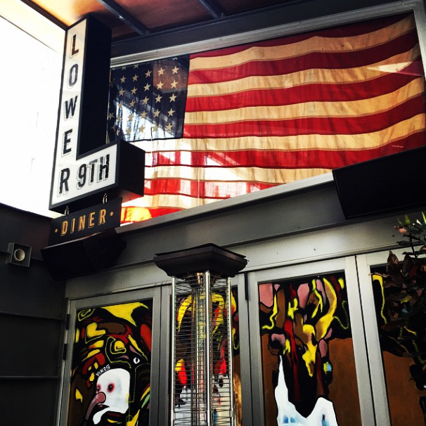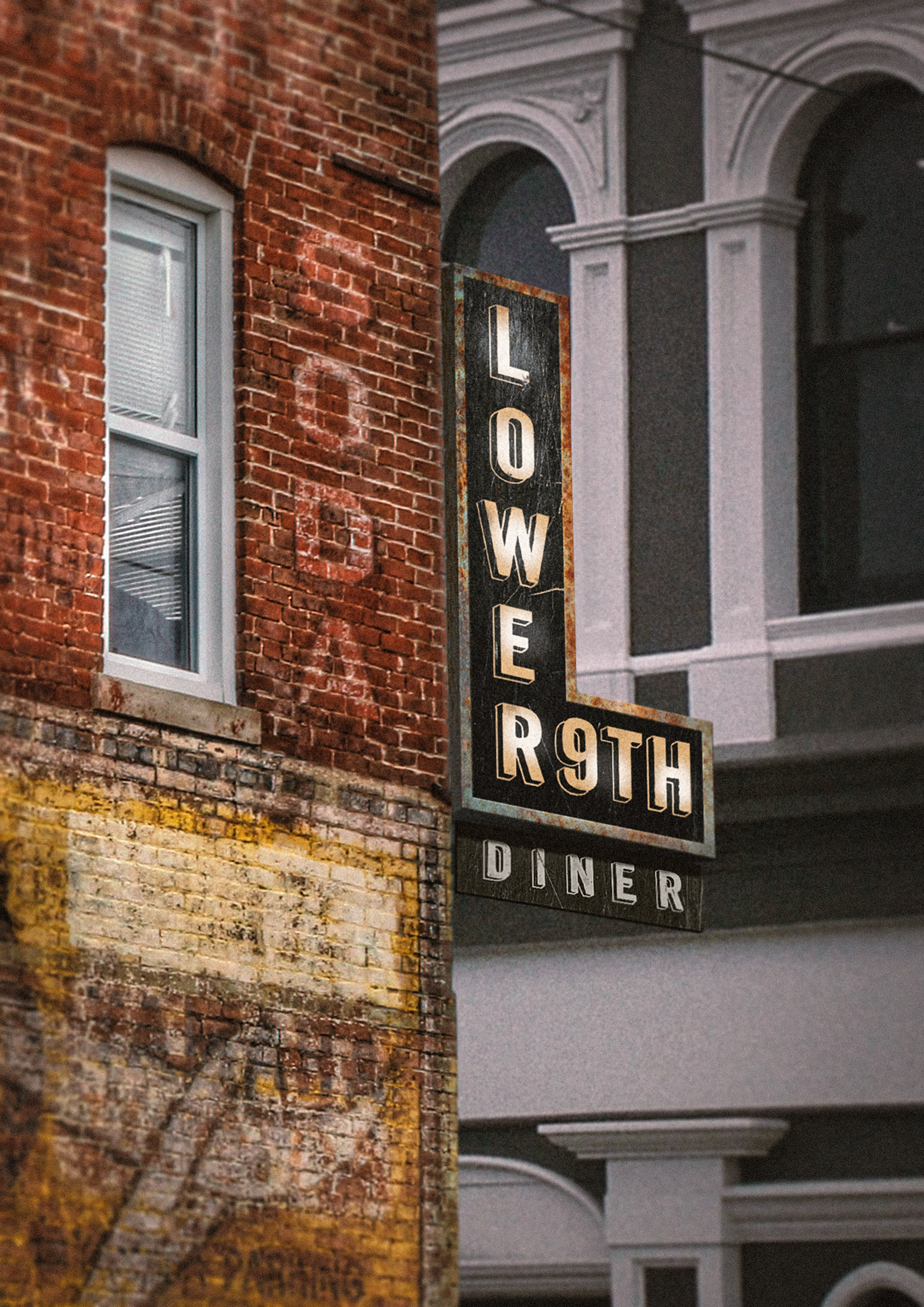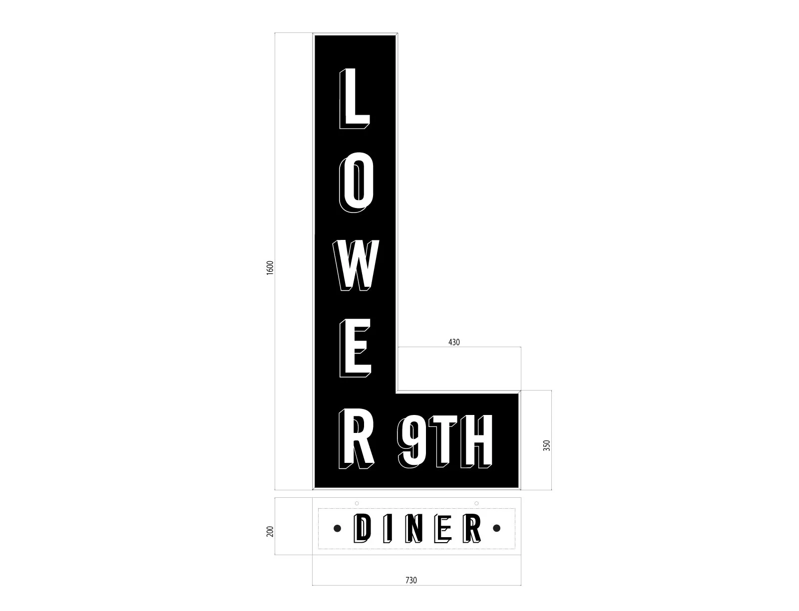 Restaurant branding/signage for burger bar 'Lower 9th' located on Strangers Lane in Christchurch.