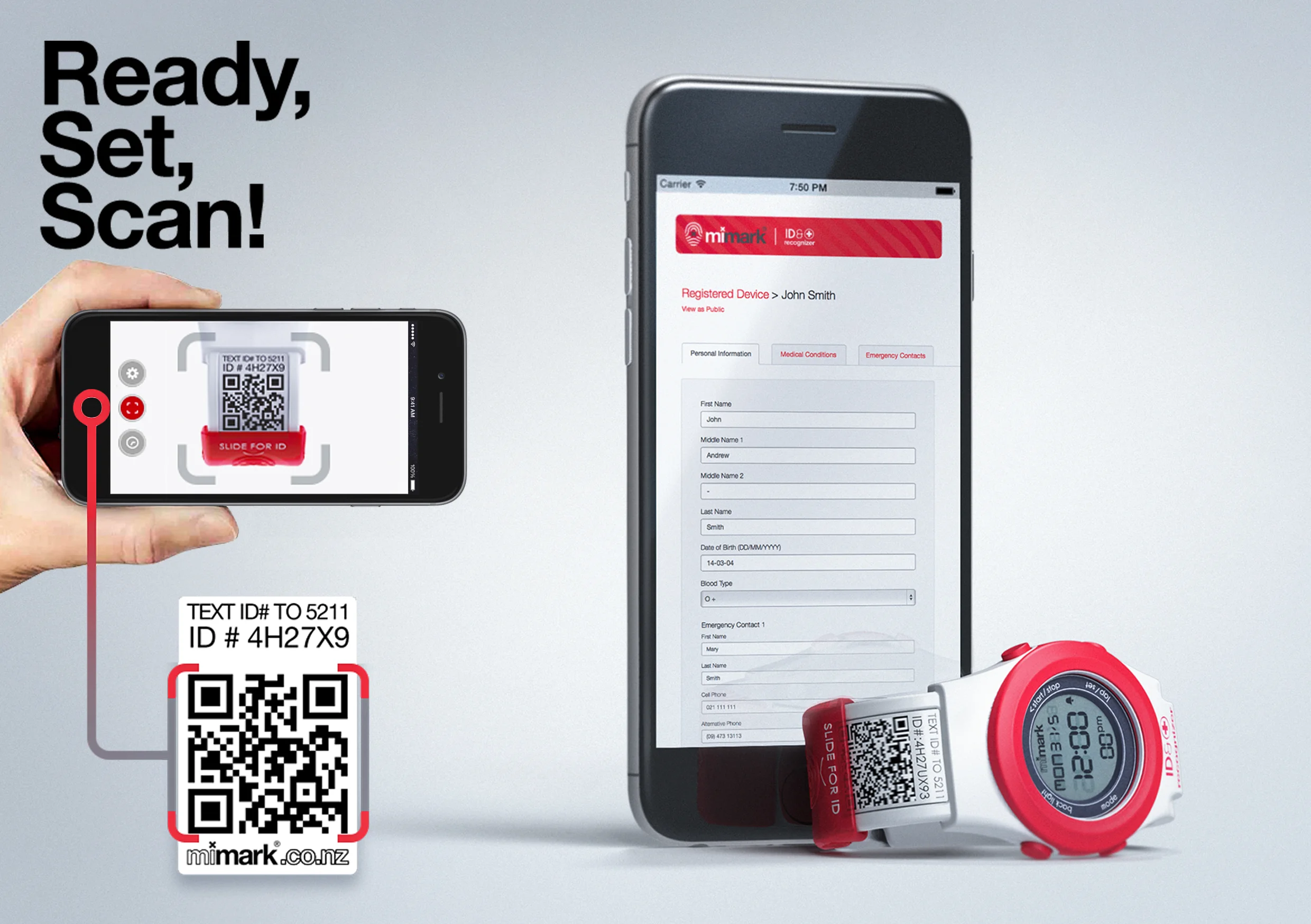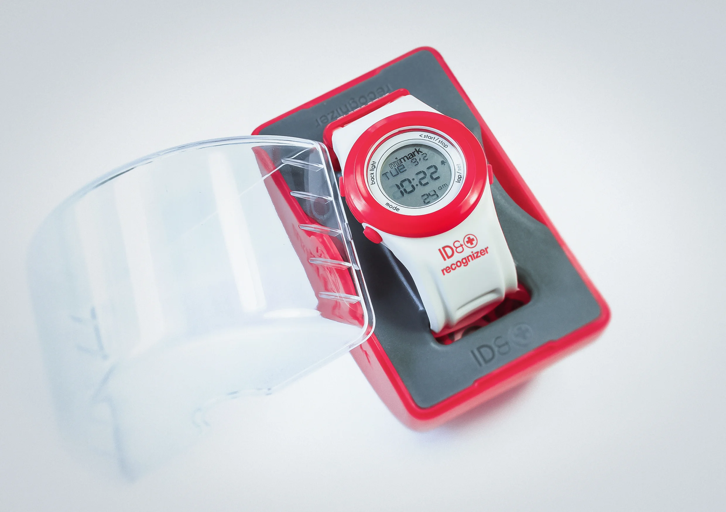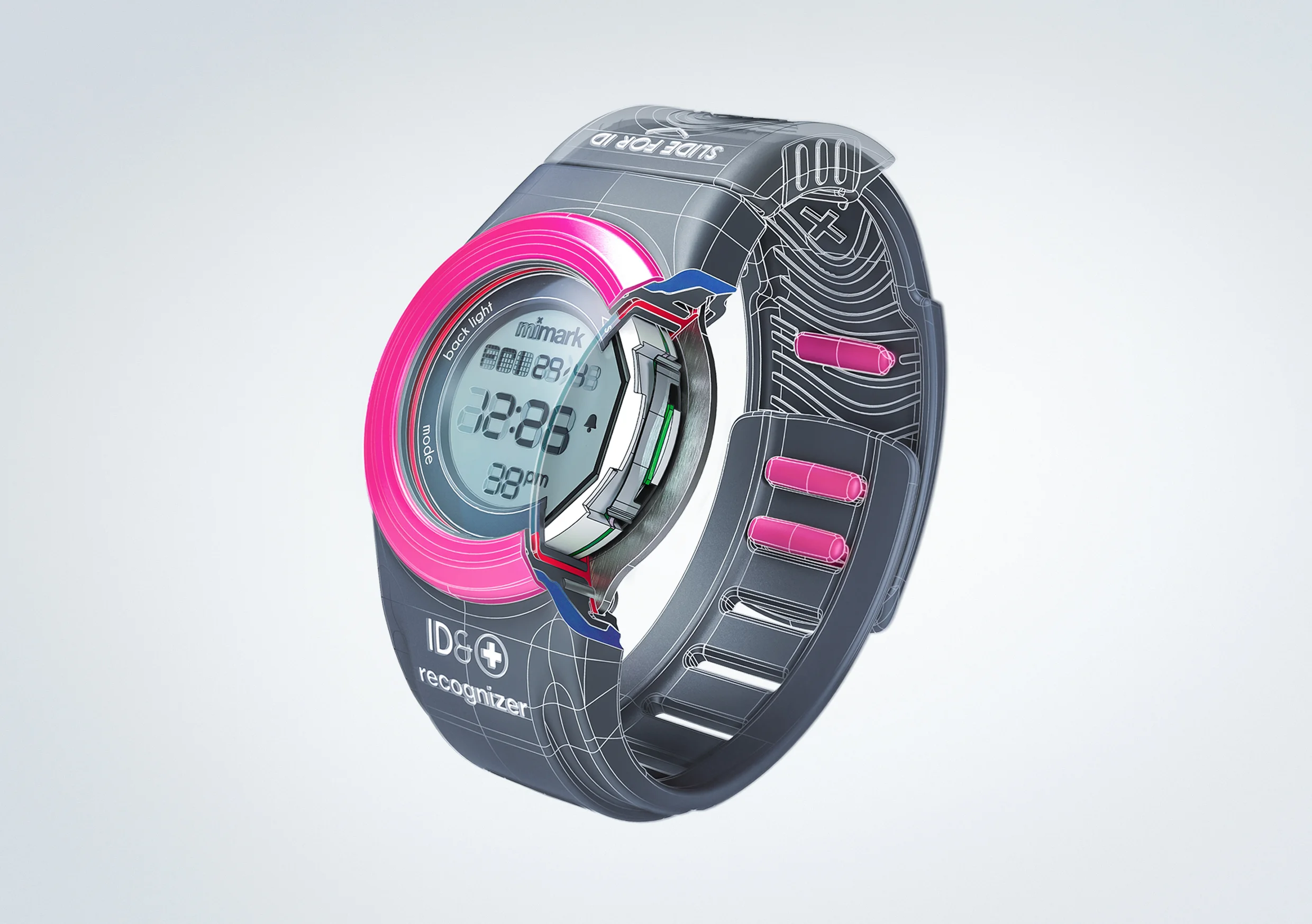 Mimark (representing “M”edical “I”nformation mark) is a watch designed for children to replace medic alert bracelets. The aptly named “recognizer” contains a simple 3 function digital time-piece coupled with a unique QR code concealed on the strap. In the event of a child getting lost or into a medical emergency, the QR code can be easily located and revealed on the wearers wrist (in the same manner as a conventional medic alert bracelet would be). Once scanned with a smart phone the first responder will be sent vital information including emergency contacts and any medical conditions. Procreate designed this product from a philosophy through to a tangible solution and all the avenues of development in between.